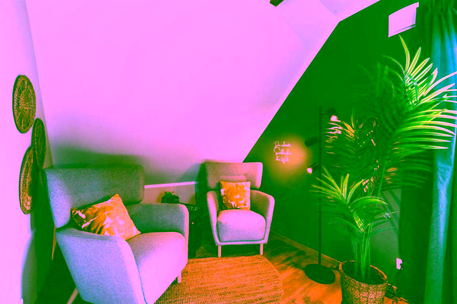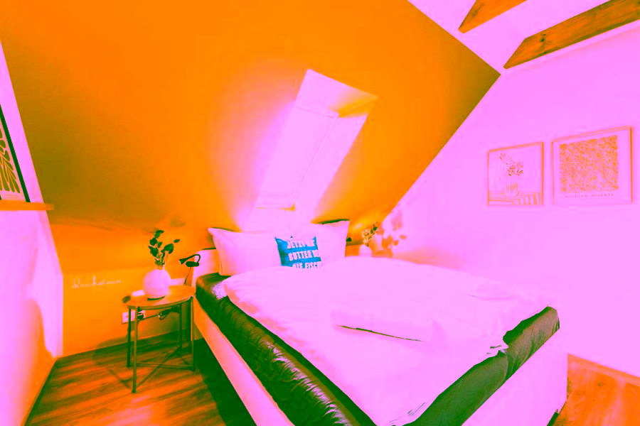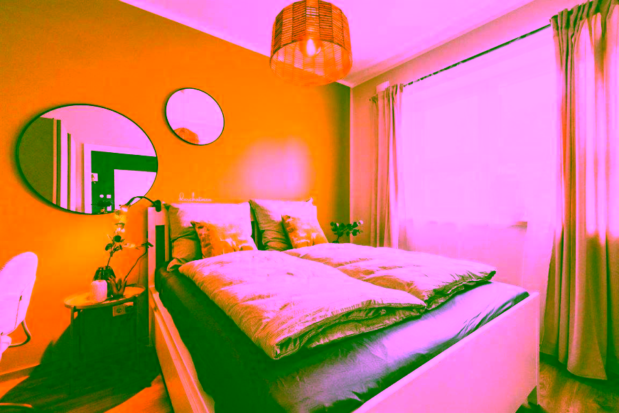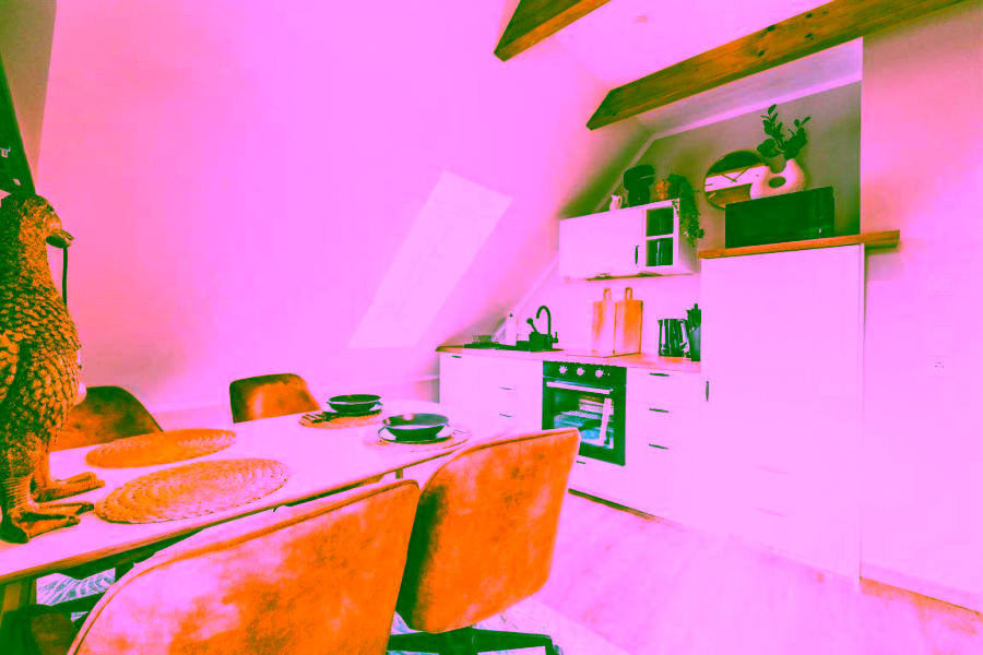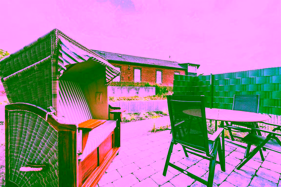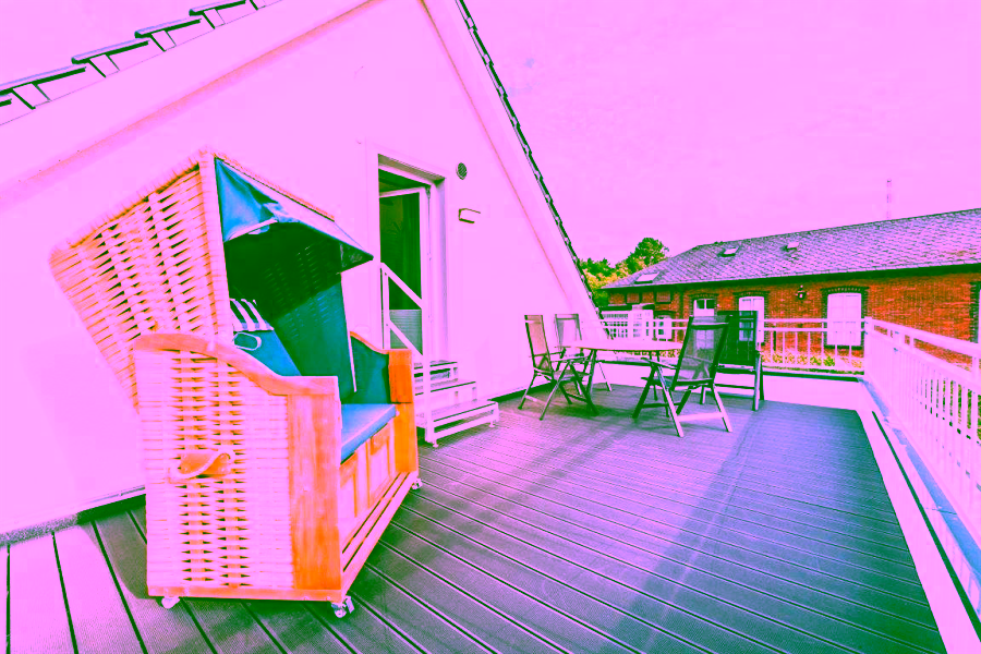 Die zweite Wohnung, befindet sich im Obergeschoss und verfügt über ca. 46 m² Wohnfläche. Sie besticht durch einen lichtdurchfluteten Wohnbereich sowie einer offenen, voll ausgestatteten Küche und einem separaten Schlafzimmer. Auch hier wurde das Tageslichtbad modern gestaltet und verfügt über eine flache Dusche, WC und Waschtisch. Ein besonderes Highlight ist die große, private Dachterrasse mit eigenem Strandkorb – ein echtes Plus für die Nutzung als Ferienwohnung.