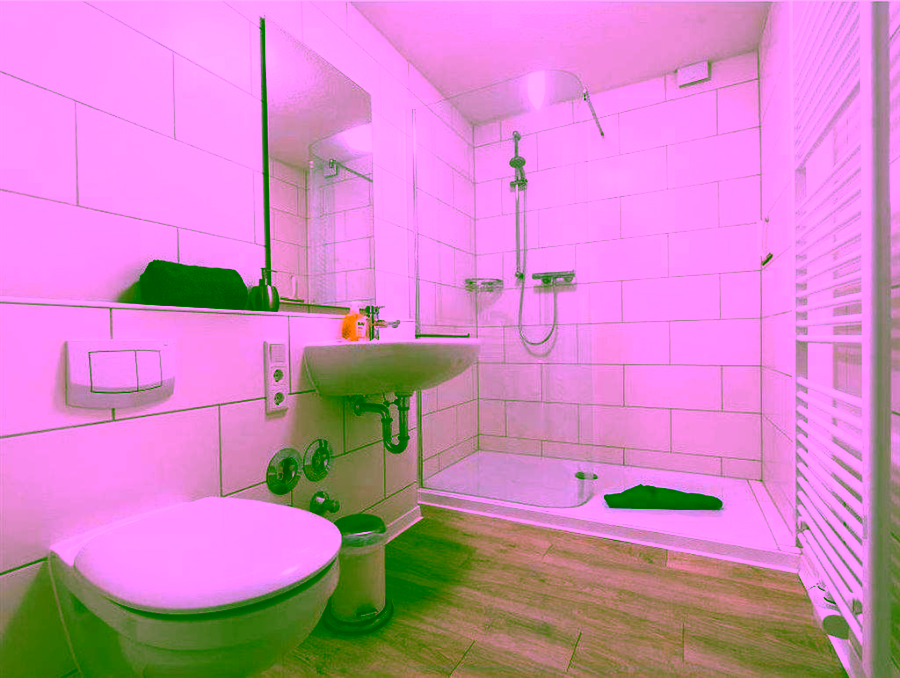 Das Schlafzimmer ist gut geschnitten und bietet ausreichend Platz für ein großes Bett sowie einen Kleiderschrank. Das moderne Badezimmer verfügt über eine großzügige, bodentiefe Dusche und überzeugt durch seine zeitgemäße Ausstattung sowie eine klare, elegante Gestaltung.